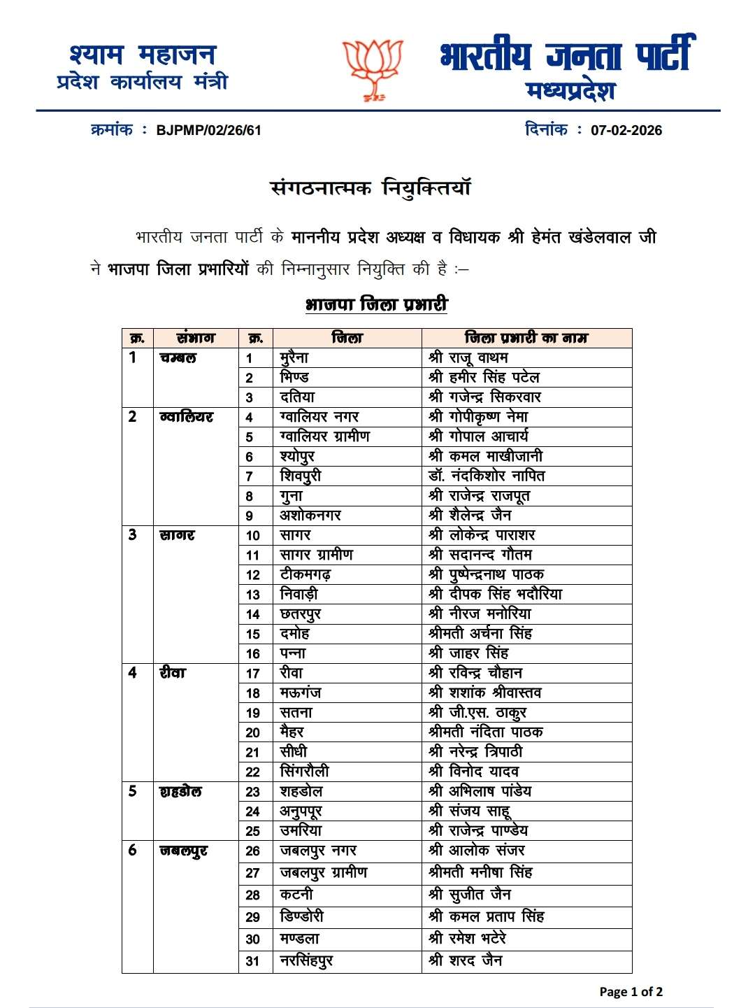 JAIHIND NEWS : बीजेपी जिला प्रभारियों की नियुक्ति Pradeep Jaiswal February 7, 2026 Share this: Click to share on X (Opens in new window) X Click to share on LinkedIn (Opens in new window) LinkedIn Click to share on Facebook (Opens in new window) Facebook Click to share on WhatsApp (Opens in new window) WhatsApp Related Pradeep Jaiswal Political Bureau Chief