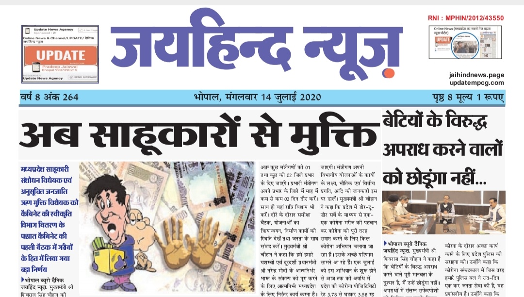 पढ़ते रहिए… भोपाल से प्रकाशित हिंदी दैनिक… जयहिंद न्यूज़ Pradeep Jaiswal July 14, 2020 Share this:Click to share on Twitter (Opens in new window)Click to share on LinkedIn (Opens in new window)Click to share on Facebook (Opens in new window)Click to share on WhatsApp (Opens in new window) Related Pradeep Jaiswal Political Bureau Chief