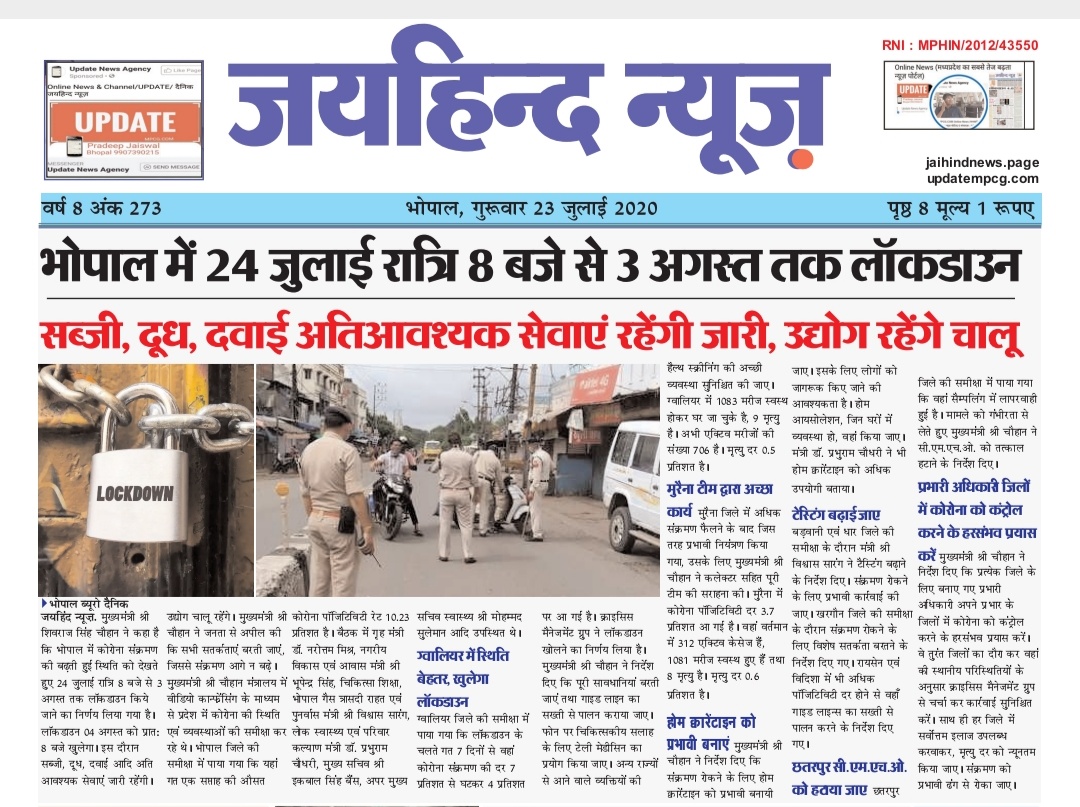पढ़ते रहिए… भोपाल से प्रकाशित हिंदी दैनिक… जयहिंद न्यूज़ Pradeep Jaiswal July 23, 2020 https://m.facebook.com/story.php?story_fbid=288784935900964&id=105286807584112&sfnsn=wiwspmo&extid=9YojKhRwcRFQiVQy Share this:Click to share on Twitter (Opens in new window)Click to share on LinkedIn (Opens in new window)Click to share on Facebook (Opens in new window)Click to share on WhatsApp (Opens in new window) Related Pradeep Jaiswal Political Bureau Chief
