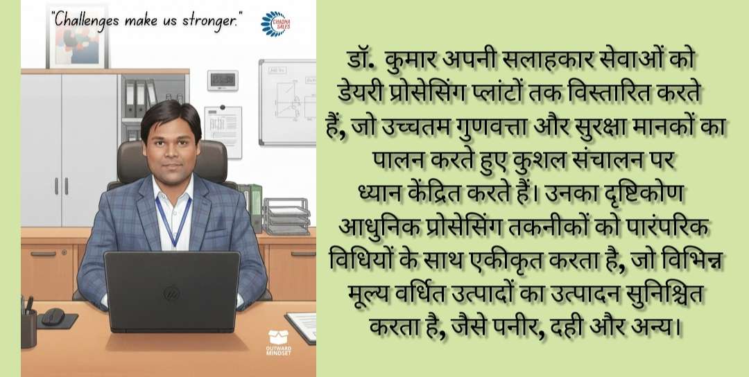 डेयरी तकनीक में पीएचडी और डेयरी क्षेत्र में पांच वर्षों के अनुभव के साथ, डॉ. कुमार सरकारों और निजी उद्यमियों के लिए एक अनमोल संसाधन बन गए हैं। उत्तर प्रदेश और असम सरकारों के सलाहकार के रूप में काम करते हुए, डॉ. कुमार इन राज्यों में गाय के फार्मों की स्थापना और मजबूत डेयरी प्रोसेसिंग प्लांट के विकास में महत्वपूर्ण भूमिका निभा चुके हैं। उनका बहुपरकारी दृष्टिकोण डेयरी फार्मिंग के पूरे स्पेक्ट्रम को कवर करता है—स्थल चयन से लेकर डेयरी उत्पादों के ब्रांडिंग और विपणन की जटिलताएं।